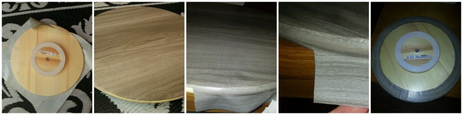 Zoals jullie op de bovenstaande foto kunnen zien had ik thee dozen met een opdruk en deze moesten er vanaf. Dit heb ik met een beitel en een mesje gedaan. Natuurlijk is dit volledig afhandelijk welke theeboxen je in bezit hebt. Hierna heb ik het draaiplateau beplakt met plakplastic. Ook dit is optioneel, maar aangezien ik mijn toren brocant wilde maken heb ik hier wel voor gekozen. Dit is een geduldig klusje en soms zie je zo hier een daar een vouwtje aan de onderzijde. Maar met het eind resultaat valt dat volledig weg. Ik heb eerst het bovenstel beplakt netjes in de ronding afgeknipt en de zijkant nog een keer beplakt en aan de onderzijde beplakt met stroken.