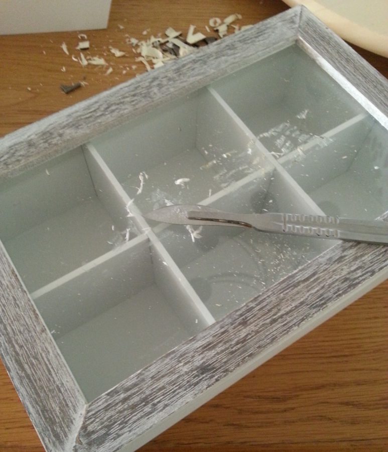 Oke we zijn klaar voor de volgende stap. Doordat de boxen in de lengte komen te staan willen we wel dat de deurtjes goed open kunnen. Het is dus van belang dat de theedoos iets hoger staat. Zaag de lat in 8 kleine latjes gelijk aan het formaat van de thee box.