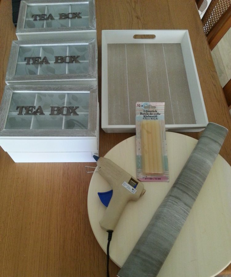 Nu is het tijd voor het plankje erop. Deze zaag je op maat, maar de bedoeling is wel dat er nog 2 theeboxen op passen zoals hieronder op de foto. Het plankje heb ik ook met het plakplastic beplakt. Vervolgens plak je ook deze vast op de boxen met je lijmpistool.