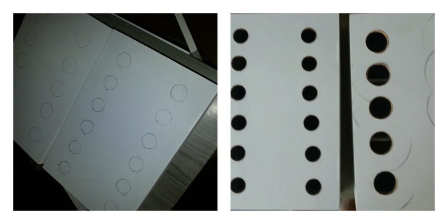Je hebt nu nog 2 theeboxen. Verwijder hier de verdeelplankjes uit. Schroef met je kleine schroevendraaier de deurtjes van de boxen. Teken de gaten af op de onderzijde van de theebox (let hierbij goed om de afmeting van je makeup brushes die je hierin kunt doen. En ook belangrijk, let op de afmetingen van de verdeelplankjes. Anders komen je makeup brushes dadelijk scheef te staan en dat is zonde. Boor de gaten in de boxen op de afgemeten plekken. Ik zelf heb gekozen uit 2 soorten maten voor mijn brushes.