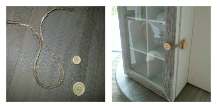 Nu is het tijd sluitingen te maken op de deurtjes! lijm op de 4 grote knopen een kleine knoop in het midden. En lijm deze op de zijkant van elke box. Hier komt namelijk het touw omheen te zitten. Maak een lusje en knoop deze en let hierbij op dat het ook op de voorzijde past. Lijm het lusje vast op de box en lijm vervolgens een knoopje ter decoratie op de knoop van het touw. Op de foto hieronder zie je het eind resultaat van deze stap.