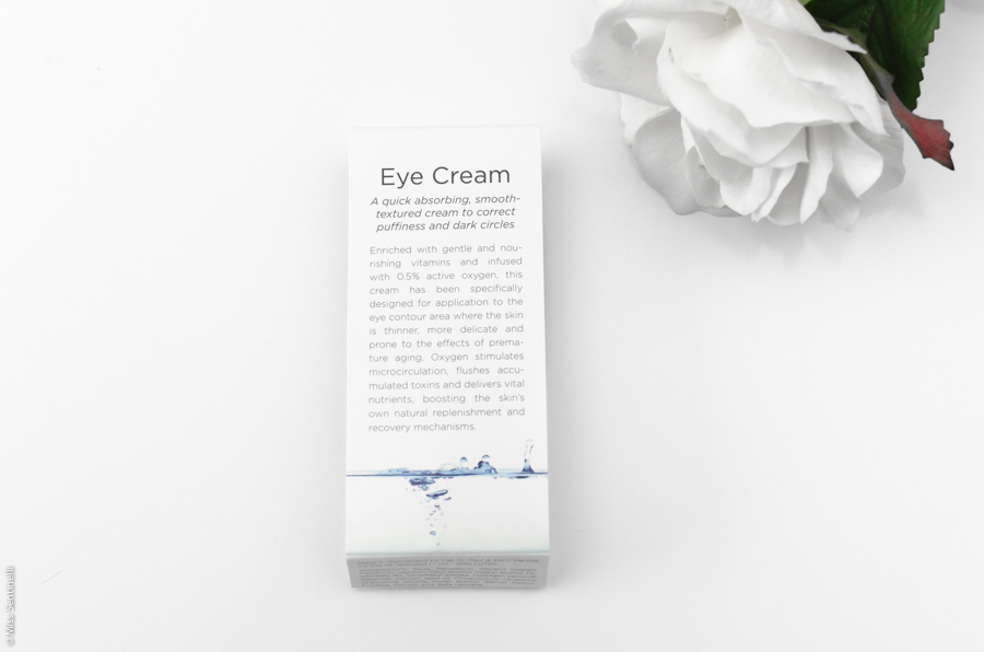Het is een unieke oogcrème met 0.5% zuurstof en voedende vitamine A, E en D3. De oogcrème moet een heldere, strakke, gehydrateerde en gelifte huid rondom het oog geven.