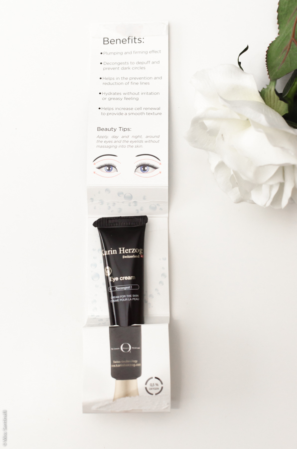 Ik kreeg van Karin Herzog dus een eye cream. Deze kwam in een hele mooie verpakking. Er zit namelijk een kartonnetje om de tube heen met een mooie bedrukking. Het geeft best een luxe gevoel.