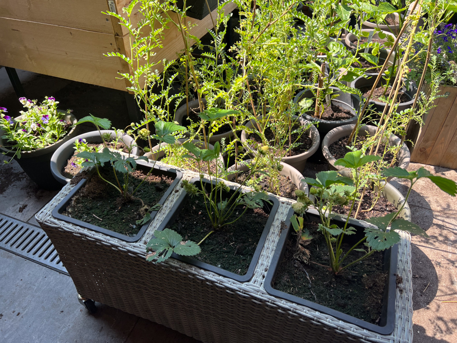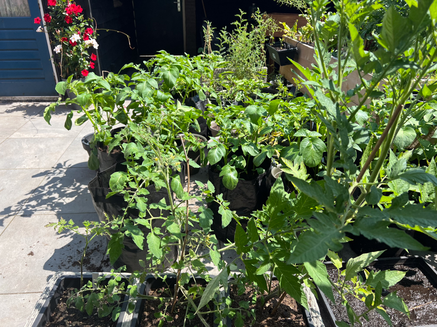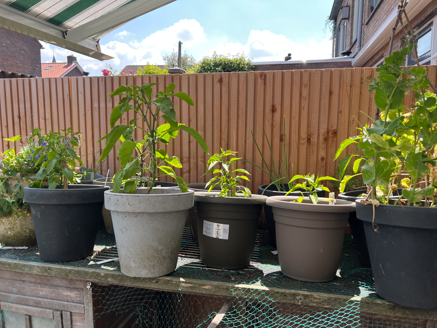 Ik heb ook nog potten staan met basilicum, bieslook, komkommer, pepers en paprika’s en kikkererwt. Er komen al een aantal kikkererwten aan. Super tof!