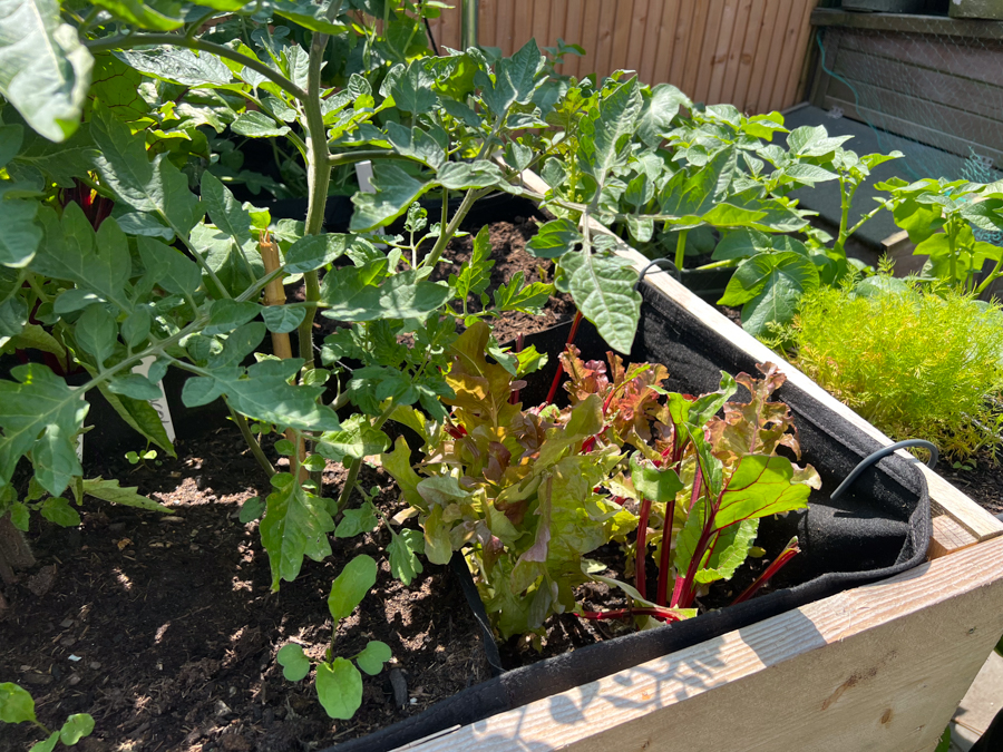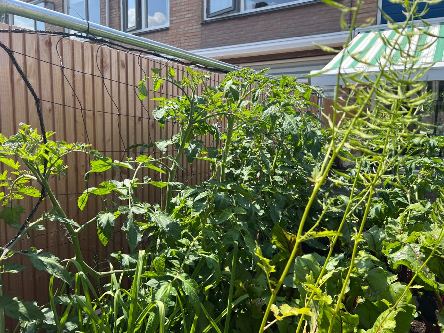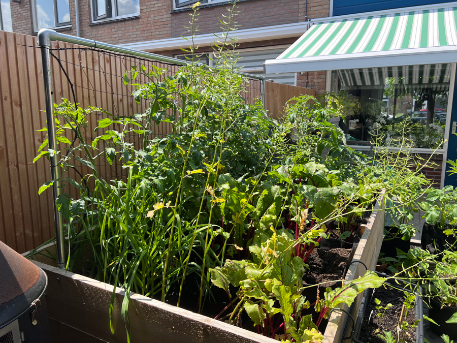 In mijn grote moestuinbak heb ik het volgende staan: Bietjes, Sla, pluksla, wortel, tomaten, mosterd, knoflook, doperwten, boerenkool en nog veel meer bietjes. De mosterdzaadjes komen er al aan en ik heb een rek van Makkelijke Moestuin geplaatst zodat de tomatenplanten en de doperwten kunnen klimmen.