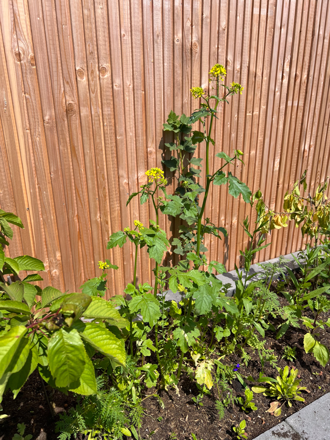 Aan de andere kant hebben we onze fruitboompjes staan. Er komen al frambozen, kruisbessen en appels. Verder heb ik in de hele bak overal bloemen verspreid staan. Alles moet natuurlijk nog groeien en bloeien, maar nu al erg blij mee!