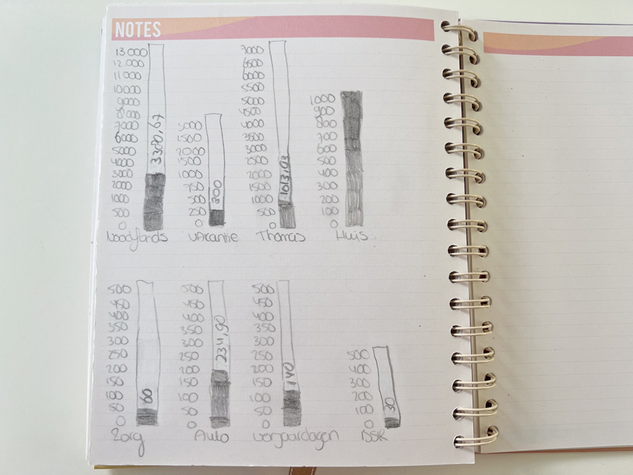 Zelf spaar ik geld voor het noodfonds op mijn rekening en in een envelop. Als ik geld spaar op mijn rekening, dan zet ik altijd bij de beschrijving “noodfonds” neer, zodat ik altijd kan opzoeken hoeveel geld van de spaarrekening in het noodfonds zit. Ik hou dan bij in mijn nieuwe Mascha Planner hoeveel geld er in mijn noodfonds zit.